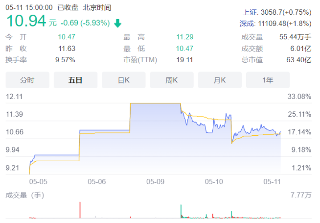 或受“假阳性”事件的影响,润达医疗股价连续两日走低,截至5月11日收盘,股价报收10.94元/股,跌幅为5.93%。此前,公司曾连获3个涨停板。